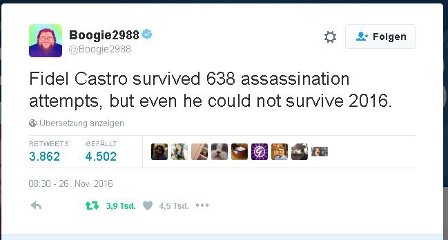 Fidel Castro survived 638 assassination attempts, but even he could not survive 2016.— Boogie2988 (@Boogie2988) 26. November 2016