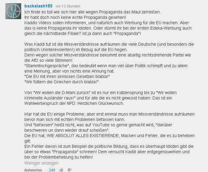 Weil morgen ja Wahlen sind und so. Eine kleine Erinnerung daran, dass die EU nicht komplett egal ist. Danke an Coldmirror aka Kaddi, die hier bei der tagesschau aushilft (ehrlicher Glückwunsch dafür!) und die ganzen Pöbelmeinungen à la AFD mal wegbasht. Und das dazu noch auf 'ne ziemlich unterhaltsame Art und Weise. Kaboosh!