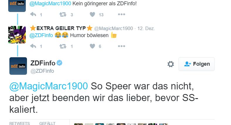 Nanu, Faschist denn beim Twitter-Kanal von ZDFInfo los? Ich dachte, wir hätten die Vergangenheit Hitler uns gelassen. Und diese Weltkriege Wortspiele auch.